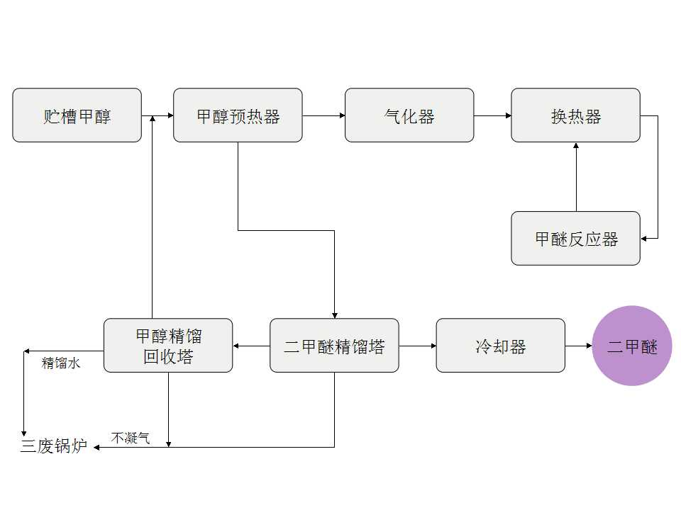 粗甲醇經(jīng)二甲醚精餾塔出 口冷凝器預(yù)熱后,送入甲醇?xì)饣鳎眉状挤磻?yīng)熱把甲醇汽化,汽化后的甲醇經(jīng)反應(yīng)器出 口換熱器換熱升溫,在220℃左右經(jīng)開車電加熱器送入反應(yīng)器上部,在260---280℃之間,經(jīng)催化反應(yīng)后,出反應(yīng)器,經(jīng)出 口換熱器換熱降溫后,進(jìn)入甲醇回收塔再沸器,替代部分蒸汽加熱二甲醚精餾后殘液,同時(shí)繼續(xù)降溫,后經(jīng)甲醇冷卻到1000℃左右送入二甲醚精餾塔,精餾出二甲醚,經(jīng)降溫后送入成品灌區(qū)。
