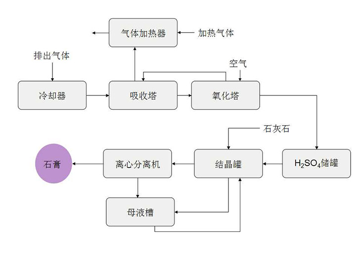 燃燒氣體在冷卻器中被冷卻到50-70℃,送入吸收塔,由上部來的稀硫酸將SO2氣體吸收除去入大氣。稀硫酸中的SO2在氧化塔內(nèi)生成硫酸,返回吸收塔。一定量的稀硫酸在結(jié)晶罐內(nèi)生成石膏,石膏經(jīng)過離心分離機后與母液分開。母液由母液槽返回到吸收塔,石膏結(jié)晶進行脫水,直到容易處理的程度為止。